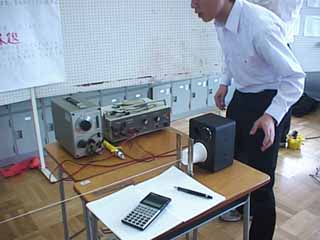 受信は紙コップにつっこんだマイク、オシロスコープです。重りで張力を変え、糸の長さ