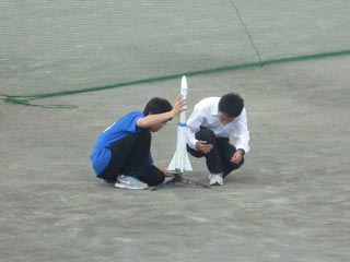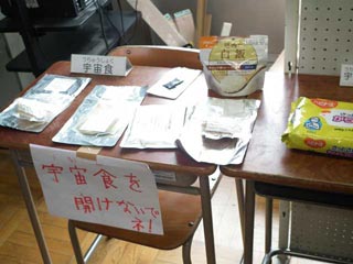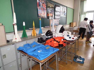 打ち上げるロケットとJAXAから借りてきた宇宙服の展示