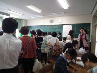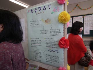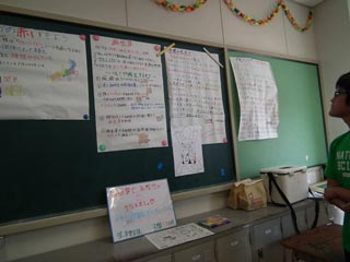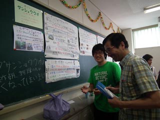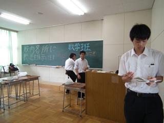 問題の解説をする班員。通路に数学の問題12問を貼り付け。