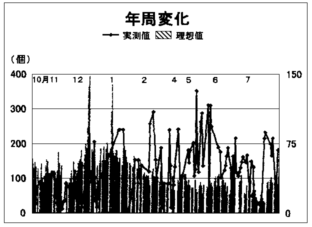 このような観測の結果、私たちの聞き取ったエコー数には増減の変化がみられることがわかった。そこで、それが確かなものであるか調べるため、文献1に掲載されていた年周変化のグラフを用いて比較した。理想値は文献1、実測値は私達の観測データを示している。