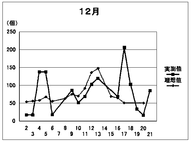 縦軸は、右が理想値、左が実測値である。この年周変化のグラフを見ても特徴はわかりにくいので、月ごとに理想値と実測値を比較した。すると、エコー数の違いはあるが、どの月も二つのグラフの増減の傾向はほぼ一致した。次のグラフは、その中でも特に形が似ているものである。