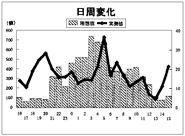 今回も年周変化と同じく、文献1の日周変化のグラフと比較してみる。縦軸は右が理想値、左が実測値である。次のグラフを見ると、数には大きな差があるが、全体の増減の傾向がほぼ一致したことがわかる。