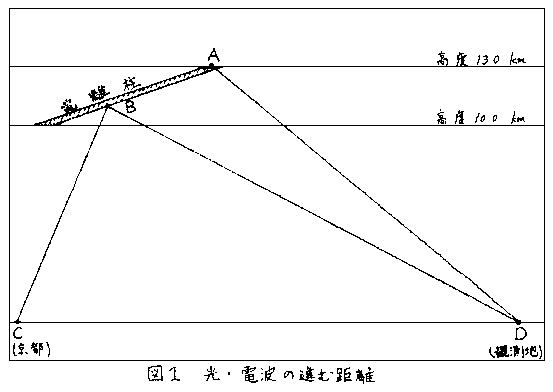 図1のようにA・B・C・Dをおくと、流星の最初の光がこちらに届くまでの距離は線分AD,電波が電離柱に反射してこちらに届くまでの距離は線分BDでもとめることができ、計算すると、