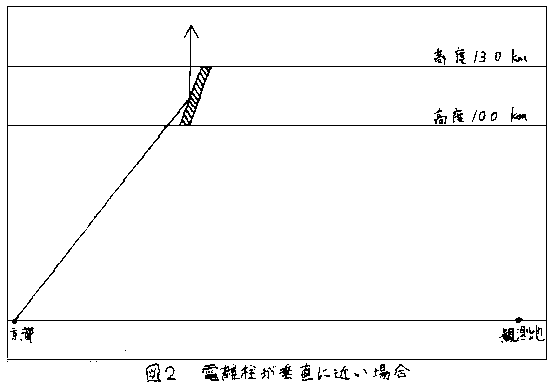 図2のように電離柱が地面に対して垂直になってくると、電離柱で鏡面反射したFM電波は、図の矢印のように飛んでいくため、エコーをとらえることはできない。