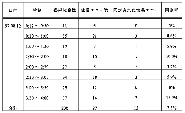 文献によると、同定率は通常10〜30%である。この数字は少なくみえる。しかし、4.でも述べたように、流星エコーをとらえられるかどうかは電離柱の角度に影響されるため、このような数字になると考えられる。