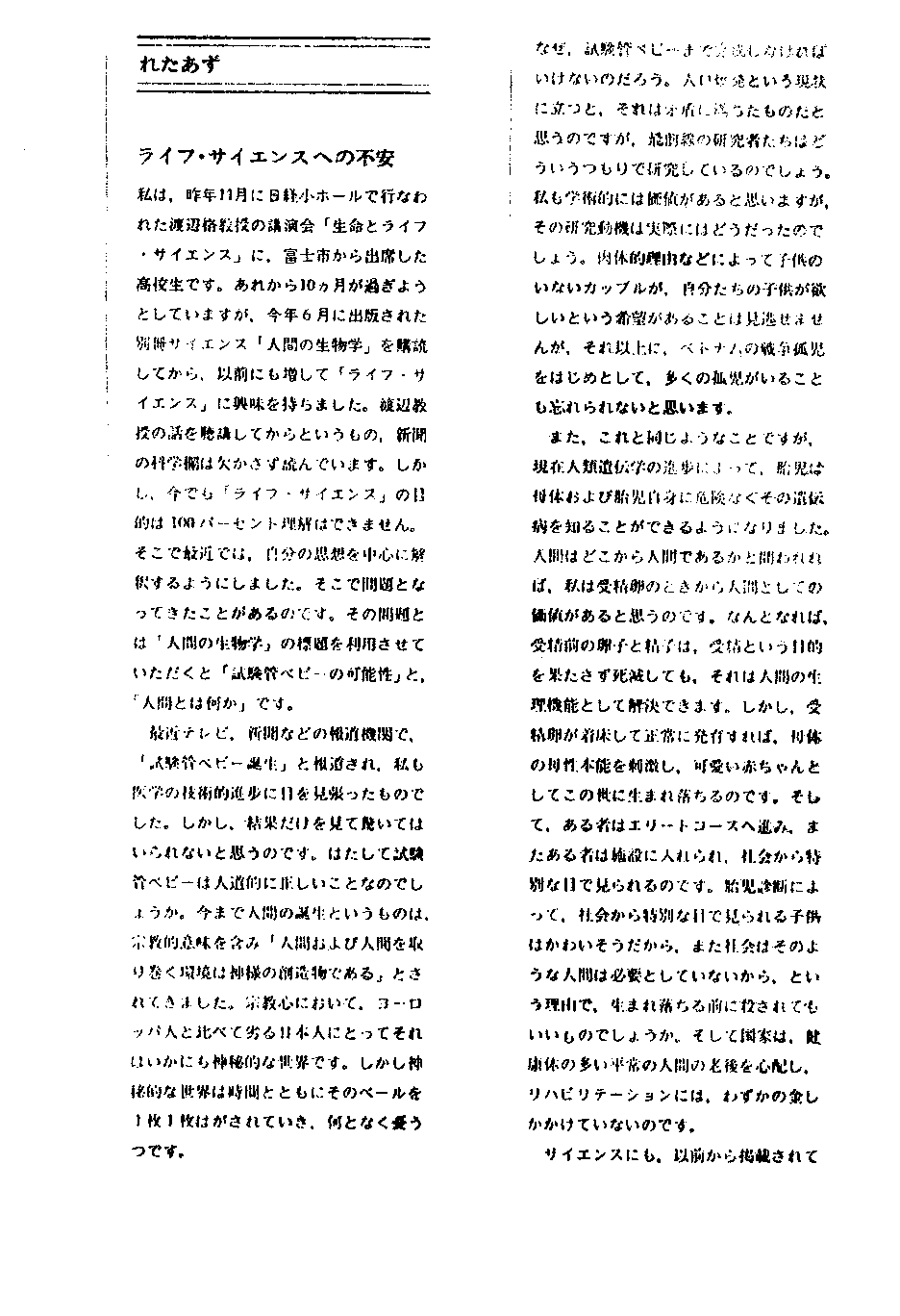 私は、昨年11月に日経小ホールで行なわれた渡辺格教授の講演会「生命とライフ・サイエンス」に、富士市から出席した高校生です。あれから10ヶ月が過ぎようとしていますが、今年6月に出版された別冊サイエンス「人間の生物学」を購読してから、以前にも増して「ライフ・サイエンス」に興味を持ちました。渡辺教授の話を聴講してからというもの、新聞の科学欄は欠かさず読んでいます。しかし、今でも「ライフ・サイエンス」の目的は100パーセント理解はできません。そこで最近では、自分の思想を中心に解釈するようにしました。そこで問題となってきたことがあるのです。その問題とは「人間の生物学」の標題を利用させていただくと「試験管ベビーの可能性」と「人間とは何か」です。