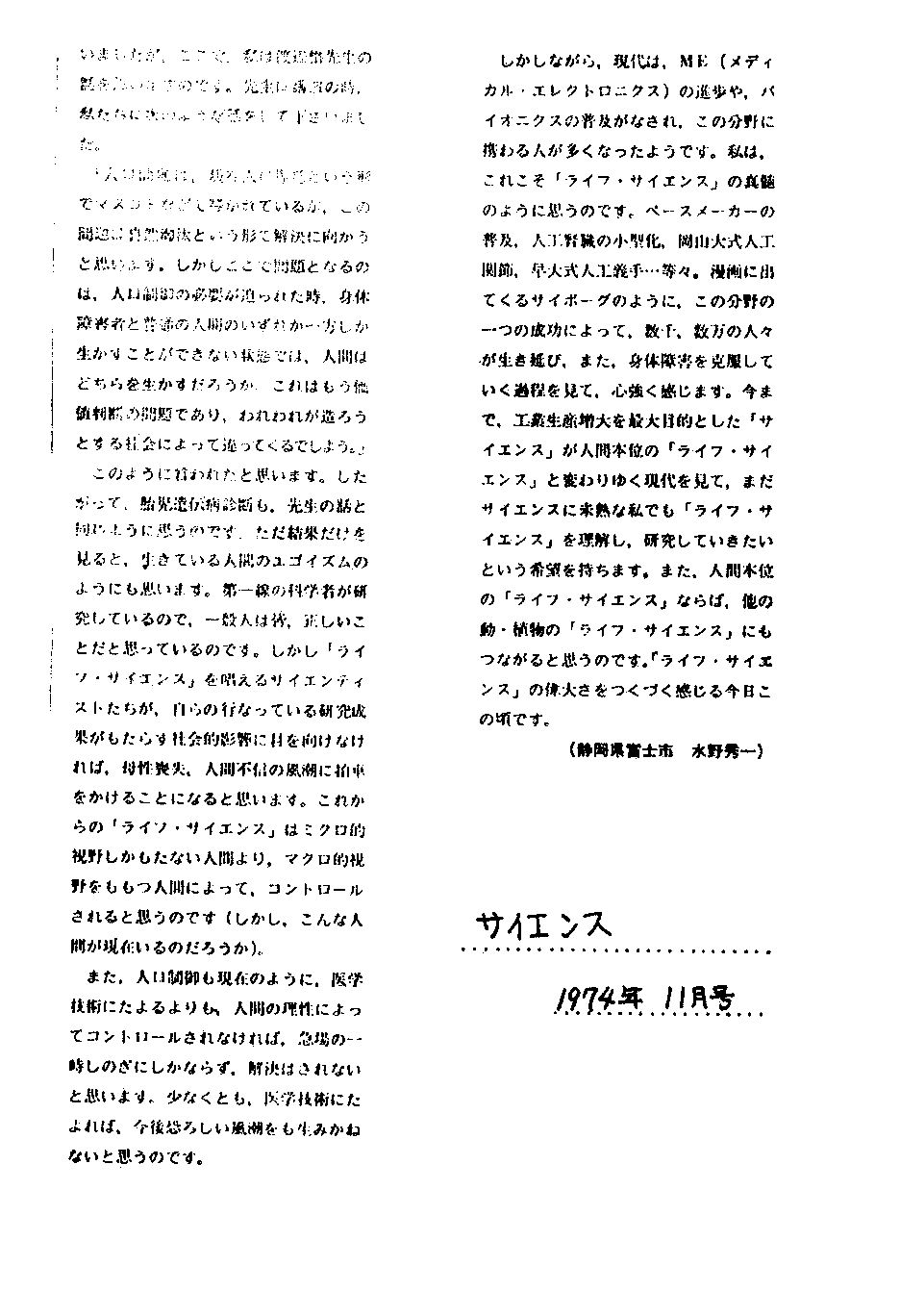 しかしながら、現在は、ME(メディカル・エレクトロニクス)の進歩や、バイオニクスの普及がなされ、この分野に携わる人が多くなったようです。私は、これこそ「ライフ・サイエンス」の真髄のように思うのです。ペースメーカーの普及、人工腎臓の小型化、岡山大式人工関節、早大式人工義手…等々。漫画に出てくるサイボーグのように、この分野の一つの成功によって、数千、数万の人々が生き延び、また、身体障害を克服していく過程を見て、心強く感じます。今まで、工業生産増大を最大目的とした「サイエンス」が人間本位の「ライフ・サイエンス」と変わりゆく現代を見て、まだサイエンスに未熟な私でも「ライフ・サイエンス」を理解し、研究していきたいという希望を持ちます。また、人間本位の「ライフ・サイエンス」ならば、他の動・植物の「ライフ・サイエンス」にもつながると思うのです。「ライフ・サイエンス」の偉大さをつくづく感じる今日この頃です。 (静岡県富士市 水野秀一) |