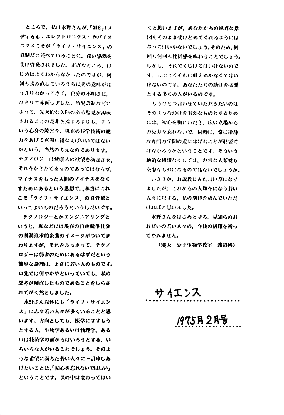 ところで、私は水野さんが、「ME」(メディカル・エレクトロニクス)やバイオニクスこそが「ライフ・サイエンス」の真髄だと述べていることに、深い感銘を受け啓発されました。正直なところ、はじめはよくわからなかったのですが、何度も読み直しているうちにその意味がはっきりわかってきて、自分の不明さに、ひとりで赤面しました。胎児診断などによって、先天的な欠陥のある胎児が淘汰されることの是非を論ずるよりも、そういう心身の障害を、現在の科学技術の総力をあげて克服し補えばいいではないかという、当然の考えなのであります。テクノロジーは健康人の欲望を満足させ、それをかきたてるものであってはならず、マイナスをもった人間のマイナスをなくすためにあるという思想で、本当にこれこそ「ライフ・サイエンス」の真骨頂といってよいものだろうというしだいです。