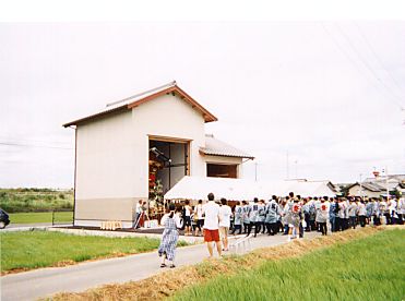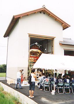 御仮宮の南、田を埋め立てて建設された蟹町の新しい屋台蔵です。祝賀会のプログラムによると、平成11年1月31日の地鎮祭の後、3月に敷地造成工事を行い、平成12年2月27日に上棟式、そして、今日8月12日に竣工式となりました。
