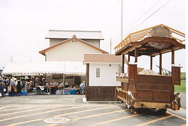 右は蟹町の曳舞台。その横の小屋は、町が建設したトイレです。 地面の下は、防火用の貯水槽となっています。 |