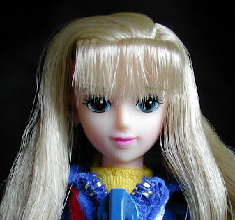 化粧は基本的に第3回フェアで発売されたリナ様達と同じです。 アイプリントは漆黒の瞳と睫に 瞳の下半分と眉毛がグレー。 縁取りは明るいスカイブルーです。 星は上が白で下が縁と同じスカイブルー。 アイシャドーは薄いブルーです。 今回のフェアでは他のフレンドのアイプリントにも スカイブルーが多用されており、 おそらく、工場の生産能力が足りず、目の色替えまで行う程余裕が無いため、 同じアイカラー(マリーンと同じか?)をベースに配色を決定しているのではないか? と私は推測しています。 |