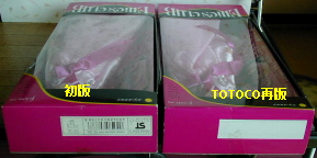 箱入りの状態の韓国リナ様です。 左が初版、右がTOTOCO再版です。 初版の方は開封済みなので、首のゴムとポリスリーブがありませんが、箱の外観は基本的に同じ物です。 なお、この時点ではTOTOCO再版の方は未開封です。 | |