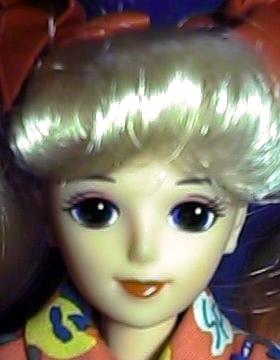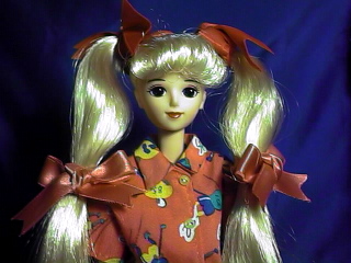 髪の色は薄めの金(ミルフィーユと同じ)髪で、 ご覧の通りのツーテールです。 (リボンは私が後で付けたもの) | |