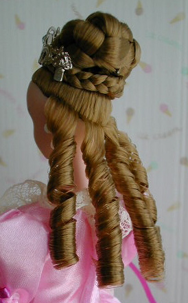三つ編みお団子で、うなじから4本縦ロールが出ています。