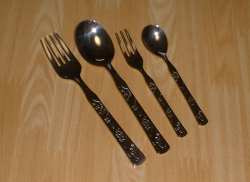 ちょっとわかりにくいかもしれないけど、恐竜の図柄のスプーンとフォークです。