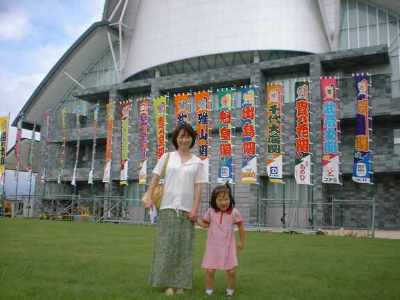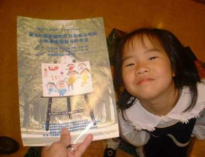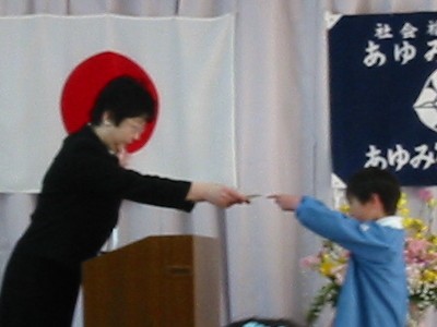 2000.10.02 夏生の描いた絵が「第26回中部地区社会福祉施設入所者作品展示即売会」のパンフレットの扉絵に採用され、開会式典に招かれてテープカットを行いました。