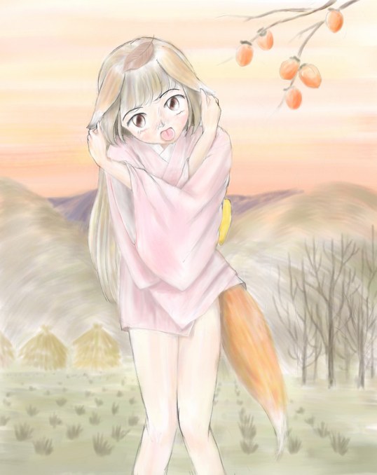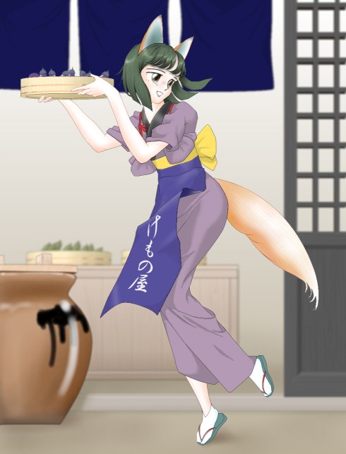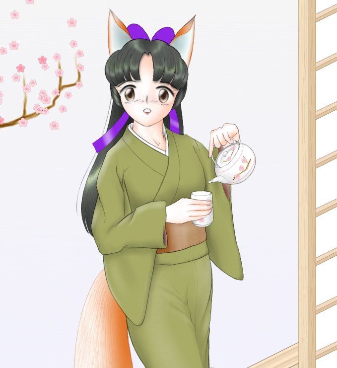トリミングしてしまいましたが、実は、お茶を淹れながら障子を足で開けているという、お行儀の悪いきつね娘なのでした。