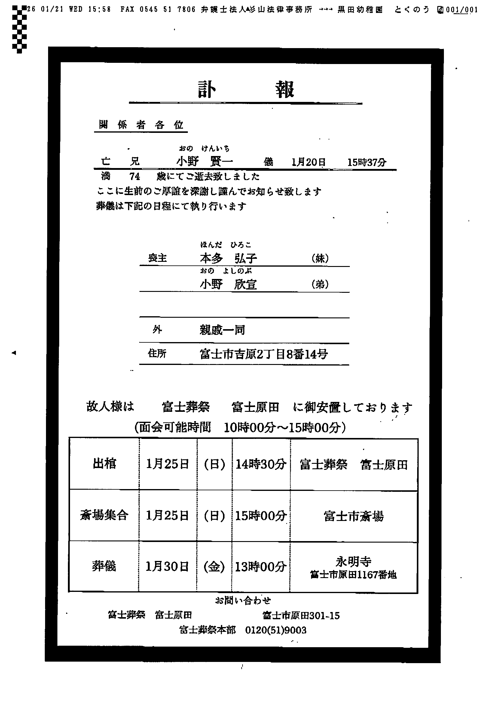 - 小野賢一さんが御逝去されました。 (1月20日)