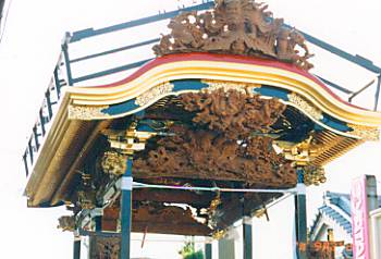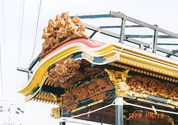 | 中町屋台の正面。金箔が輝いています。 | 後から見たところ。見事な彫刻です。 |