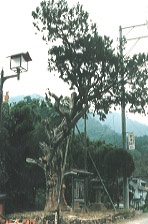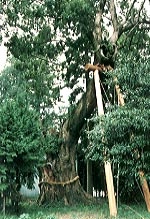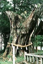 大クスは鳥原神社の裏側、道路から入ったすぐのところにある。3mほどの高さで三つに分かれた幹のうち、太い方の2本がもぎ取られたように折れて無残な姿になっていた。残った一本の幹には木製の立派な支柱が作られていた。幹が折れてさえいなければ、国か県の天然記念物に指定されていたはずである。幹の胸の高さに横綱が締めるような太いしめ縄が巻かれていた。