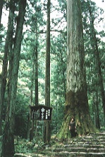 鳳来寺の参道に入ると路傍にあった山頭火の句碑 「たたずめば 山気しんしん せまる」 の景色の中に入った。さらに山門を潜ると参道脇の句碑がある。 「霧深し 大傘杉は どれならむ」 巨杉が参道の両側に立ち並んで霧がなくてもどれが『大傘杉』か分からない。ようやく看板を見つけ『大傘杉』と分かるが、分かってみれば他のどの巨杉より太く風格があった。まっすぐに37m、枝の無い幹がほとんど太さを減ずることなく屹立する。そしてその上に23mの枝のある幹が続く。