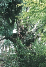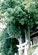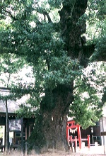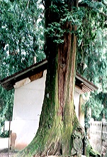 境内に上がって社殿右手、赤い瓦屋根の倉の裏にそのヒノキはあった。根張りが立派なヒノキであった。幾つかに分かれた太い幹の一本が雷にでもやられたのか、上部で切断されていた。