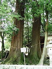 神社の左側に「磐照神社の親子杉」がある。最も太いスギを父、次に太いスギを母、手前の細いスギを子供に見立て、親子杉と命名された。父スギと母スギは根元が融合して一体化している。