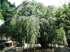 山門を入ると狭い境内いっぱいに枝垂れ桜の巨木がある。沢山の竹でしだれ枝が支えられ、まるで竹林に生育しているように見える。少し斜めになった下側に縦に割れるように洞が空いていた。