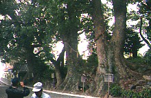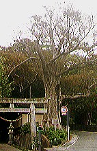 細江神社の境内にはクスなどの巨木が鬱蒼と繁り、昼なお暗い。境内の7本のクスノキの巨木のうち、『夫婦楠』(写真下)は根が区別不可能なほど一体化してしまっている。