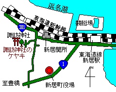 新居関所には『湊神社の祭礼』の大きな幟が立ち、遠くから太鼓の音が聞こえて浮いた気分になる。新居関所に駐車したまま、諏訪神社まで歩いて行く。途中でお爺さんに道を聞いたところ案内してくれた。山に沿って6つのお寺が並び、その一番南側に諏訪神社はあると話す。諏訪神社は奉納煙火(手筒花火)で有名な神社だとも言う。細い路地の角を何度か回り神社前の大欅の見える所まで案内して、役目は終ったというように老人は帰って行った。