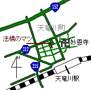 旧東海道を東に戻り、天竜川駅の近くを探す。民家の屋根を越えて繁る巨松を探したが見当たらず、お寺の境内だろうとお寺を探すが見つからない。聞くと行き過ぎたといわれ戻って、ようやく建て込んだ民家の間に、巨松を見つけた。