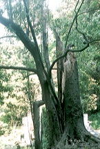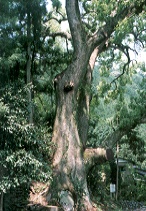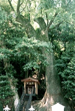 『若宮八幡大クス』は正面からは太い幹が幾本にも幹分かれして異様を誇っている。しかし一端裏へ回ると、後ろ半分が朽ちてモルタルで補修を受け、皮一枚残ったところや、それすらも無くなり竹垣で代用されているところなど、悲惨なありさまであった。