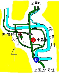 国道52号線を但沼から左へ折れて和田島へ向かう道へ入り、400メートルほど行った、バス駐車場の裏に但沼神社はある。