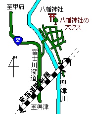 興津から国道52号線を北上し新幹線のガードをくぐって間もなく、国道は左へ大きく曲がるが、その手前で興津川へ下る道を取り、八幡橋を渡って八幡神社に至る。