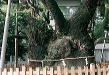 『富知六所浅間神社の大クス』は本殿右手にある。このクスはすこぶる異形である。3mほどの高さまでど太く、そこから2本枝を伸ばしたさまが、まるでVサインをしている手のように見える。裏へ回ると幹が二つに裂けて分かれていた。太い幹は中が空洞になっているが、樹勢はすこぶる旺盛であった。