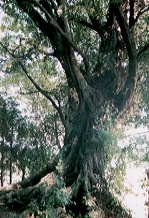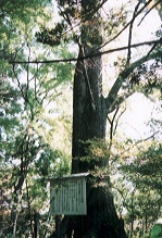 富士スピードウェイの南側のサブゲートの東1kmに上野神明社がある。ツクバネガシは道路側に幹をせりだすように立っていた。道路側から見ると幾種類もの蔓性の植物が寄生していて、今にも朽ち落ちそうな幹に見えた。ところが一段高い境内側からみるとまだ充分持ちこたえそうであった。本来なら道路側に支えがほしいところだが、町指定の天然記念物のわりにはそれほど大切にされているようには思えなかった。