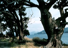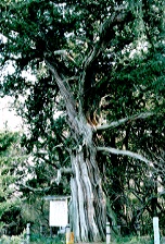 この小さな岬には昭和7年に国の天然記念物に指定されたビャクシンがある。ビャクシンは子供の頃、近くの公園に植わっていて、登って遊んだことのある木である。もともと日当たりの良い所を好むため山林や森の中には育ち難い木といわれ、この海岸端の日当たりの良い所だから成長した。この小さな森に130本以上のビャクシンが生育しているといわれ、そのうち捩じれたような幹の樹齢が千年を越すものも多いという。