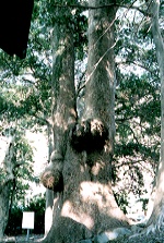 部田神社にはクスノキの巨木が本殿を囲むように8本生育しているが、最大のクスノキ「こぶ付き大クス」は本殿裏側左手のもので、地上3〜4mの所に大きなこぶがある。さらにその下にももう一つこぶがある。その木以外にもこぶのある木がある。木のこぶは虫が入ったためだというが、虫の付かないクスノキにつく虫とはどんな虫であろうか。