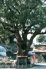 「安楽寺のクス」は安楽寺山門外の水路のほとりにあった。一見枝張りも立派で若々しく、樹齢1000年の言い伝えはにわかに信じがたいものがあった。