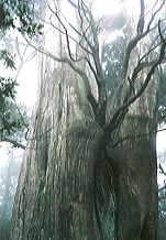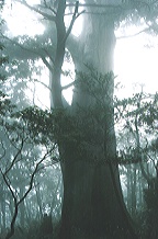 その先すぐに川へ下る農道があり、川底にはコンクリートが打たれて、車が渡れるようになっていた。靴を脱いで沢の流れを渡る。農道はすぐ尽きてた。道を塞ぐいばらを分けて林に入った。登山道は荒れていおり、忘れた頃に出てくる標識杭、白ペンキと赤い布が頼りの苦闘だった。何度も迷いそうになった。1時間半ほどの登山でやっと尾根上のコウヤマキに達した。案内書の「徒歩1時間」の簡単な表示にだまされたようだ。「遭難しないようにいってらしゃい」というおじさんの言葉の方が正しかった。山慣れない人は誰か案内を頼んだ方がよいと思う。県の天然記念物なのだから、登山道をもう少し整備してほしいとも思う。