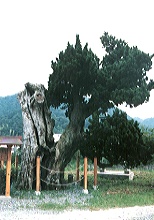 「三島神社の夫婦クス」樹下のおじさんに教わった巨木である。主幹は枯れて根元は空洞になり、高さ3mほどを残すだけとなっている。しかし主幹から分かれた支幹が一本元気で太くなり力強く枝葉を伸ばしていた。