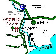国道136号線を南伊豆町から下田市へ入り、吉佐見バス停の三叉路を海の方へ右折し、300mほど言った右手に巨木に覆われた八幡神社がある。 吉佐見に入る辺りから渋滞に入り、車は寸刻みにしか進まなくなり、八幡神社に至るまで随分時間を要した。無理もない。神社の先は0.7kmほどで夏の大浜海岸である。