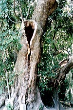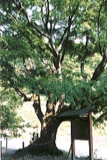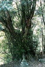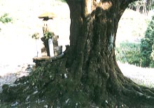 『嶺樹庵のイロハモミジ』は『もみじ荘』のそばに連なる山々の絶景を見下ろすように立っている。平岡忠夫さんの著書、『巨樹探検』に紹介されていて、『あした、晴れたら森へ行こう』にはこのモミジの平岡さんの絵がのっている。ところが実物は絵と比べて一回りスケールが小さいように見えた。ひょっとすると石仏が安置されている辺りの幹が裂けて倒壊してスケールが小さくなったのかもしれない。幹が裂けたらしい痕が目立たないように補修されているようにも見える。