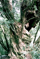 『杢左衛門の大赤樫』は急斜面の底にあり、アカガシの先はさらに絶壁に近く落ちている。太い幹肌に左へねじれるように筋肉のようなくびれが出来ている。5mほどのところで二又に分かれて太い右側が元が空洞になって危うく見えた。