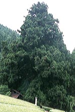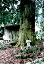 茶畑に囲まれて根元に小さな石の祠が一つ。祠の側から小さな泉が湧き水が湧き出ている。下枝が枯れずに残って地面の触るほどで、昔から一本だけ立っていた事を思わせる。杉としては珍しく枝葉に隠れて幹がよく見えない。
