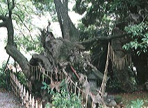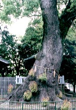 神社社殿の右手に御神木のこのクスノキはある。後ろに少し反った太い幹は均整のとれたほれぼれするような姿である。ここは旧東海道から西へ250mほど北に入ったところで、往時ももっと若々しい姿を旅人に見せていたに違いない。