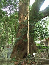 平成元年の環境庁全国巨樹調査で巨木として報告されているのはこのクスノキ一本だけであるが、石段を上がった本殿左のクスノキも幹回り5mは下らない立派な巨木であるし、狭い社域中にクスノキを中心に10本近い巨木があるように見えた。