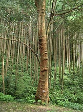 豊浦神社にはもう一本紹介すべき巨木がある。本殿右側で、枝打ちされた細い杉林を背景にして、孤立する「バクチノキ」が随分太く見える。赤っぽい幹に小さな瘤が沢山出来ている。