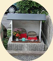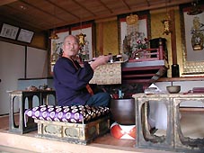 一里塚から少し歩いた右側に、「倉野磨崖仏」の案内板があった。てっきりこの近くに磨崖仏があるものと思った。そこは人家の前の広い空地で、磨崖仏がありそうな崖地も見当たらない。磨崖仏の在処を誰かに尋ねたいと思い、空地に車で来て片隅の焼却炉にゴミを運ぶおじさんがいたので、「この倉野磨崖仏は?」と問い掛けた。「ちょっと待って、内の人に言ってあげるから」とその家に入り、「すぐ来ますから」とゴミ運びに戻る。おばさんが出てきて「今開けますから」とお堂らしきところを開け、「今来ますから、どうぞお参り下さい」と招じ入れる。何か変だなと話しながら待っていると、作務衣を着て首に輪袈裟をかけた高齢の老人がやってきた。歩くのが少し不自由なようだ。「よくお参りくださいました」 お参りに来た訳でもないのだけど。そして我々に合掌させて般若心経を上げた。(左写真)「これはお守りです。無料ですから」とお守りを二つ頂いた。いいのかなあ。話すうちに、我々がわざわざ御参りに来たのではないと察したようだ。
