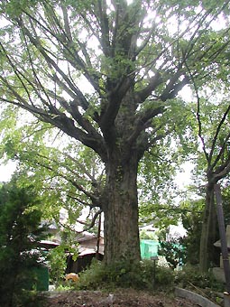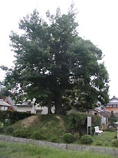 守山市今宿に入ると、ちらほら古い町並みが見えてきた。右側に中山道で初めて目にする一里塚の「今宿一里塚」があった。(右写真)榎はニ代目だというが、もう立派に一里塚を覆っていた。